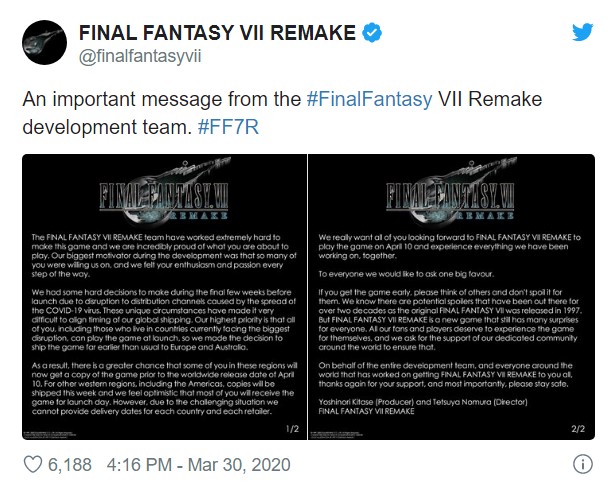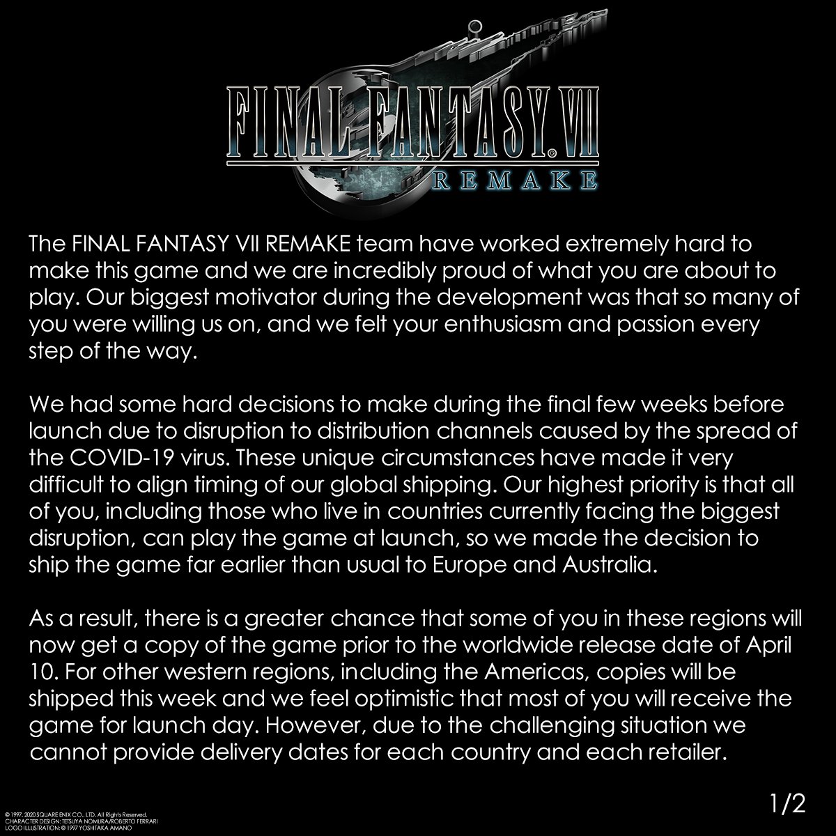 《最终幻想7:重制版》官方推特上贴出了两则重要通知,第一则通知是告诉玩家们,在新冠疫情严峻的时刻,他们的首要任务是所有玩家,包括疫情严重国家的玩家,都可以在发售时玩到游戏。但SE还是决定向欧洲和澳大利亚地区先发货。(目前看只是实体版)