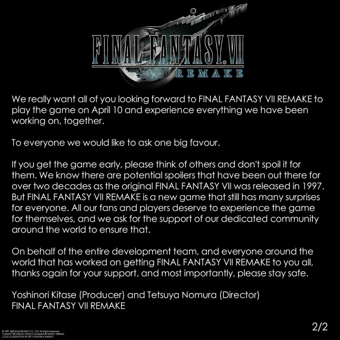 在第二则通知中,SE在请求玩家们帮一个大忙,他们请那些提前收到游戏的玩家不要进行剧透。SE表示虽然《最终幻想7》1997就出了,大家都很熟悉了,但是《最终幻想7:重制版》还是一个全新的重制版本,能给大家带来惊喜,所有的玩家理应亲自体验这款游戏。