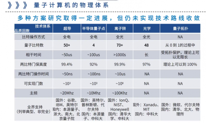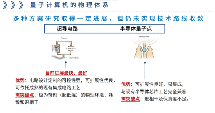 在学术界和工业界,虽然多种方案研究都取得一定进展,但仍然没有实现技术路线收敛。目前进展最快、最好的技术是超导电路。