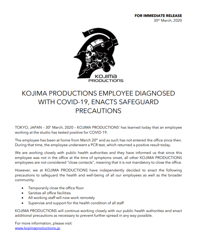工作室方面正在和公共卫生机构进行紧密合作,后者表示因为该职员出现症状时并不在办公室内,因此其他的所有小岛工作室成员都不被算作“密切接触者”,这意味着不会被施行强制隔离。