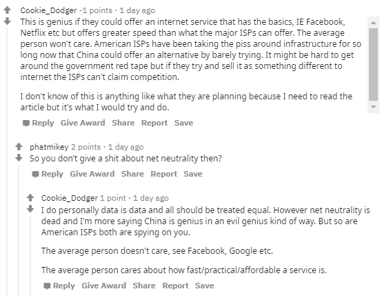 用户 Cookie_Dodger 认为,“数据就是数据,所有数据源都应该被平等对待,尽管网络中立性已死......普通人关心的是服务有多快、多实用、是否支付得起”。
