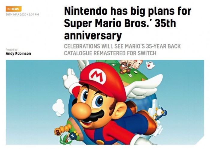 任天堂Switch在2020年剩下的时间里的一线阵容将以新老马里奥游戏为主,以配合第一代马里奥游戏的35周年纪念日。这一消息是来自Eurogamer网站中知晓任天堂未来计划的内线人事透露,这与VGC之前公布的报告也相吻合。