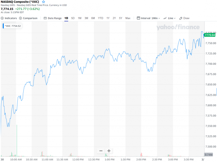 北京时间3月31日消息,星期一美股收高,三大股指涨幅均超过3%,科技板块涨逾4%。截至收盘,道指涨690.7点,涨幅为3.19%,报收22327.48点;标普500指数涨85.18点,涨幅为3.35%,报收2626.65点;纳指涨271.77点,涨幅为3.62%,报收7774.15点。