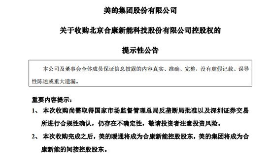 据媒体报道,美的集团拟通过下属子公司广东美的暖通设备有限公司(简称“美的暖通”)以协议方式收购北京合康新能源科技股份公司(简称“合康新能”),收购总价为7.4亿元。收购完成后,美的将通过美的暖通拥有合康新能23.73%股权。