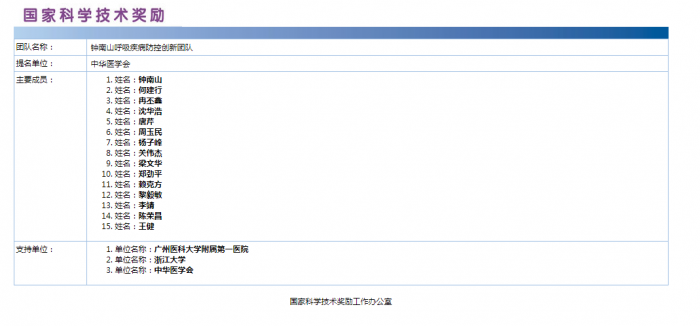 3月24日,国家科学技术奖励工作办公室发布公告,对2020年度国家科学技术奖受理项目进行公示。在国家科技奖创新团队奖评选中,钟南山呼吸疾病防控创新团队获得提名。
