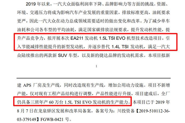 相关文件显示,一汽-大众成都工厂的1.5TSI EVO发动机技术改造项目已经在2019年8月向属地发改局备案,项目建成后,1.5TSI EVO发动机的产能可达60万台/年。