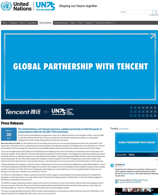 3月31日消息,联合国在纽约总部宣布,腾讯公司成为其全球合作伙伴,为联合国成立75周年提供全面技术方案,并将通过腾讯会议、企业微信和腾讯同传在线举办数千场会议活动。这意味着,在新冠病毒疫情之下,迄今为止规模最大的全球对话将在中国互联网科技企业的技术支持下进行。联合国发布官方新闻称,“这是一项全新且创新的全球合作”。