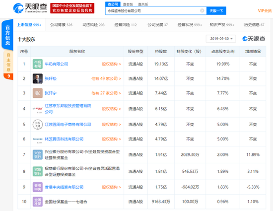 天眼查十大股东信息显示,永辉超市股份有限公司的最大股东为牛奶有限公司,持股比例为19.99%,公司第二大股东和第三大股东分别为张轩松和其哥哥张轩宁,持股比例分别为14.70%和7.77%。此外,京东和腾讯分列公司第四和第六大股东,持股比例分别为6.43%和5%。