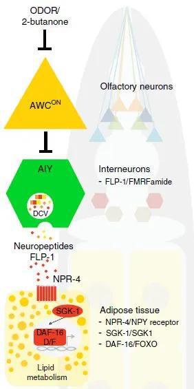 考虑到不同嗅觉神经元的活动受到特定气味分子的调节,这个现象让科学家们猜测,刺激AWC嗅觉神经元的气味分子,也许可以直接调节脂质代谢和脂肪储备。