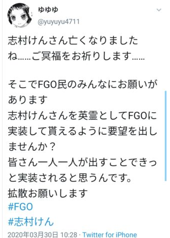 ·作为对大师的怀念,有经典游戏FGO的玩家们首先坐不住了,发声呼吁一起转发扩散,希望将志村健应该加入英灵阵营,不知型月公司作何感想。