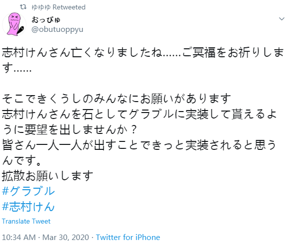 ·网友们则是议论纷纷,多有批评其曾热度之嫌,该推主也迅速删除了自己的推特,不过已经有不少FGO玩家在跟风转发了,当然志村健的家人估计不会允许这种事情发生。