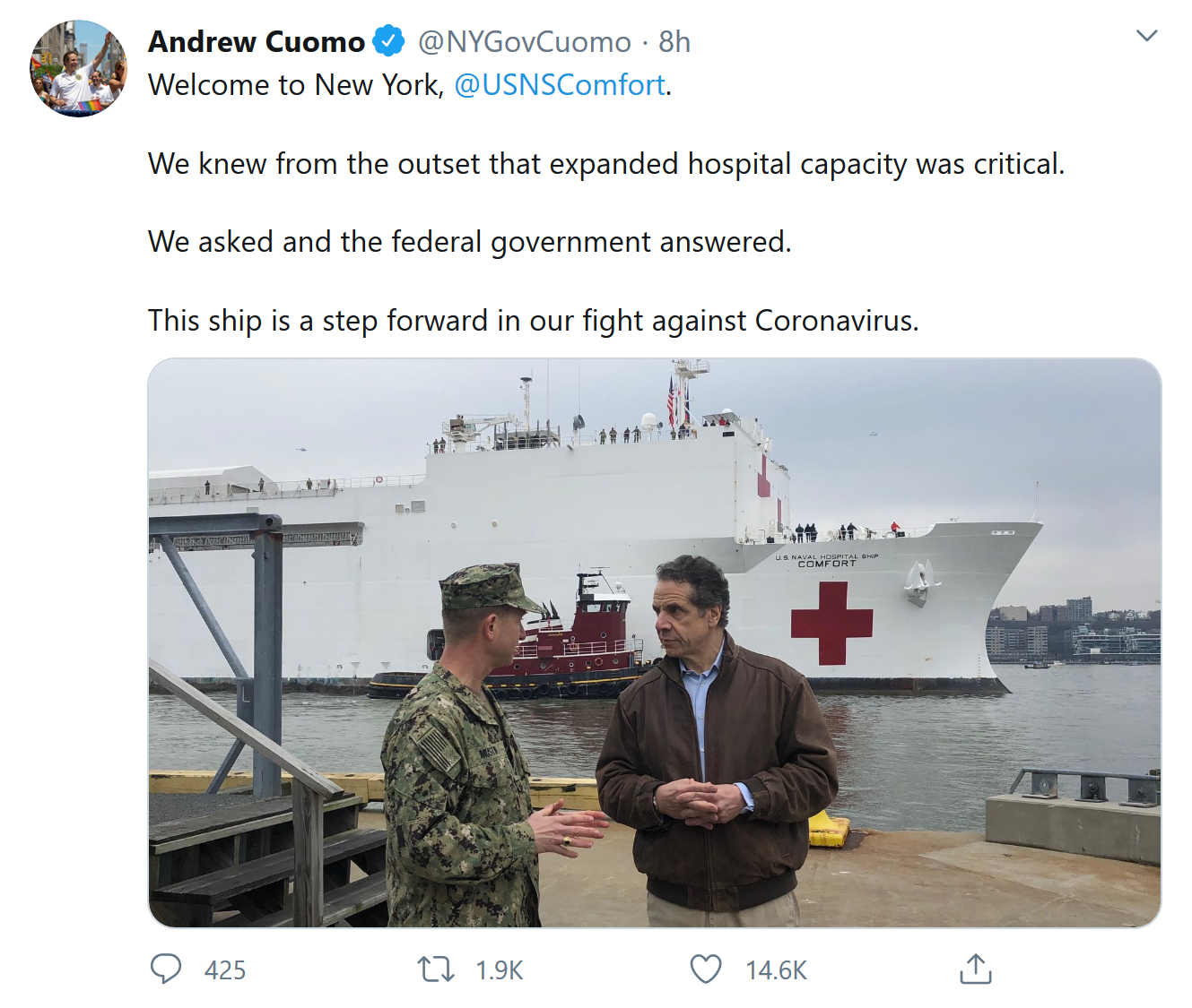 据了解,这艘医疗船平常主要用于支持美国海外的军事行动和人道主义危机以及地震和飓风救援。在抵达纽约之前它在拉丁美洲为那边卫生保健系统不够健全的国家提供帮助。上一次驻扎在纽约市发生在9/11恐怖袭击后。