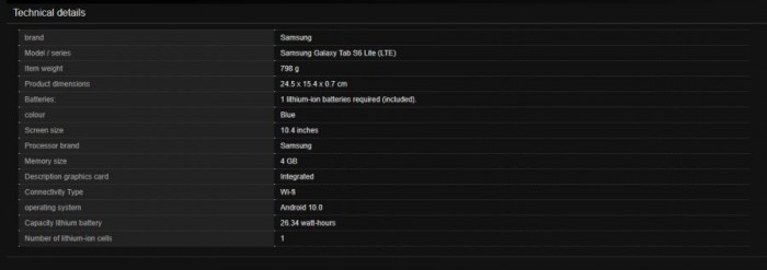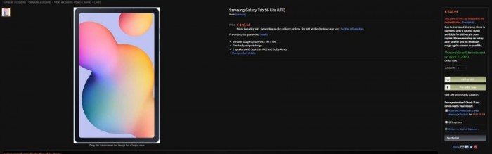 今天德国亚马逊意外提前上线了Galaxy Tab S6 Lite的产品页面(目前已删除),曝光了该机的完整规格配置以及售价情况。规格上确认了此前曝光的信息,产品售价为428.44欧元(约合3348.81元),显示会在4月2日上市发售。