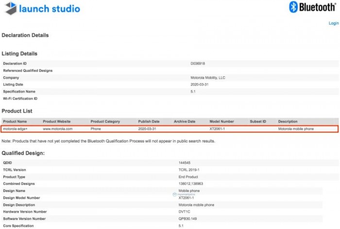 不断有消息称摩托罗拉正在开发两款旗舰机型--Motorola Edge和Motorola Edge +,而现在后者已经通过了蓝牙SIG的认证。在认证文件中显示设备型号为“XT2061-1”,并且在产品名称中明确表明为“Motorola Edge+”。这是首次确认这款新机的官方名称。