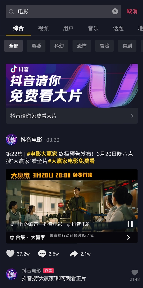 过年期间,想必不少小伙伴都享受到了抖音免费看电影的福利。并且,大家肯定都希望抖音这样的福利越多越好。好消息是,近日,抖音宣布,继《囧妈》、《大赢家》之后,抖音再请大家免费看百部经典口碑大片。福利领取方式上,同样简单,只需在抖音App中搜索“电影”,点击首页头栏的“抖音请你免费看大片”,就可进入免费看专区。