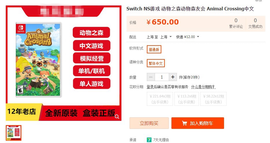 这家淘宝店的《集合啦!动物森友会》特典版卖到了709元,但是由于是附带NS动物之森原装包,还是情有可原。但是另外一家(如下图)淘宝店,标注12年老店,却将繁中普通版卖到了650元。