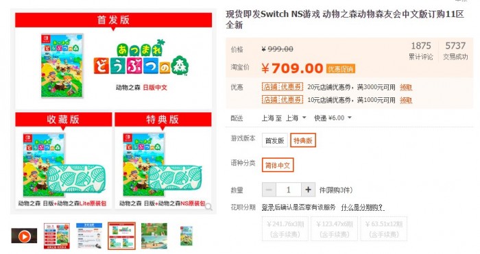 任天堂的大部分新作发售之后都会引发一股热潮,这次火遍全球的《集合啦!动物森友会》更是延续了任天堂游戏产品一贯的“理财产品”作风,国内售价继续上涨,淘宝的售价最高有到709元的,而且大部分都接近600元。