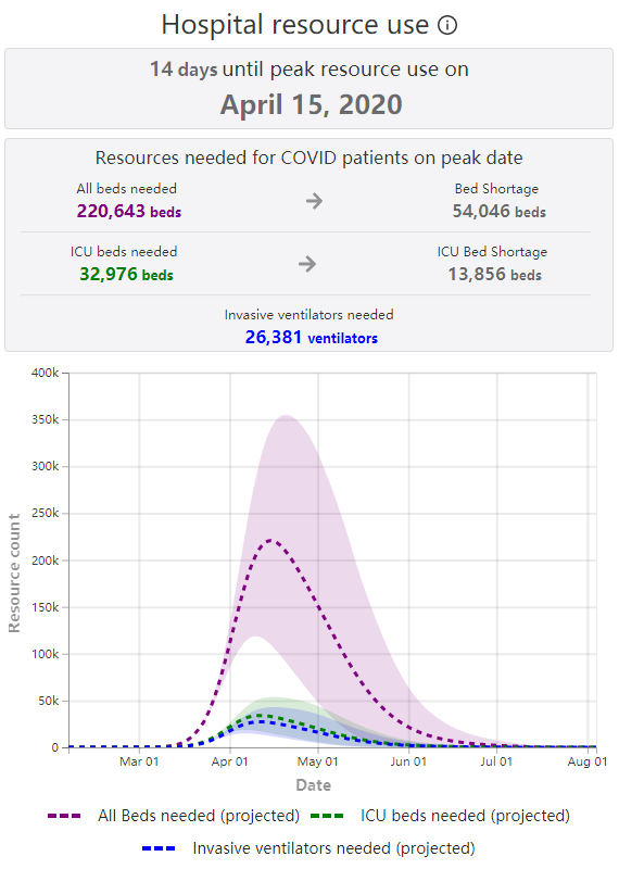 此外,华盛顿大学健康指标研究所的研究人员们已经提出了一个模型(传送门),以预估每个州将于何时达到医院和医疗资源使用量、以及感染死亡人数的最高峰。