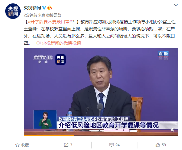 据王登峰表示,在学校教室里面上课,是聚集性非常强的场所,要求必须戴口罩;在户外、在运动场,人员没有那么多,且人和人之间间隔较大的情况下,可以不戴口罩。