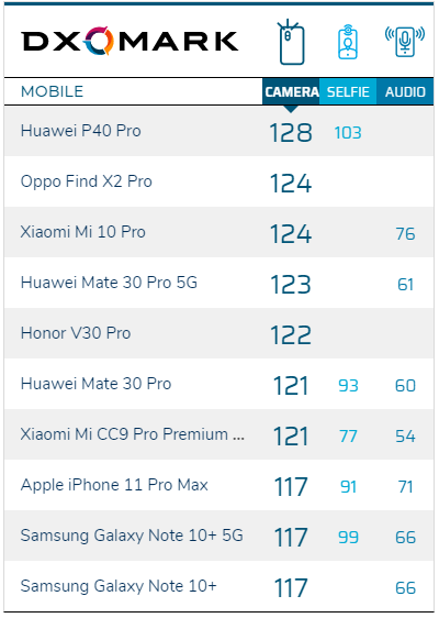 以下为最新的DXOMark手机拍照排行榜: