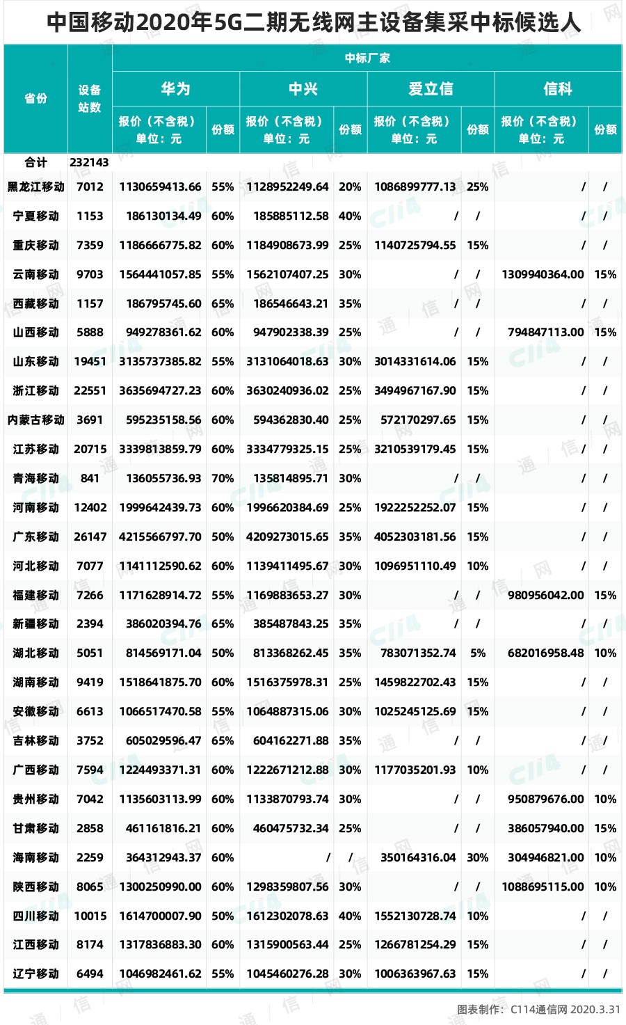 3月31日,中国移动采购与招标网显示,中国移动2020年5G二期无线网主设备集中采购工作已于日前结束,中标候选人包括华为、中兴通讯、爱立信和中国信科(大唐)等。