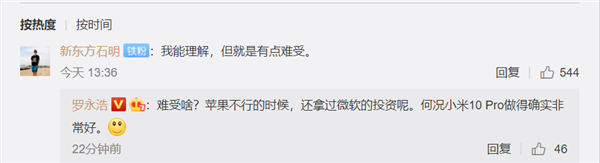 3月31日消息,锤子科技CEO罗永浩预告4月1日晚上8点的抖音直播带货要卖小米10手机。有一位铁粉留言:我能理解,但就是有点难受。罗永浩本人回复:难受啥?苹果不行的时候还拿过微软的投资呢,何况小米10 Pro做得确实非常好。