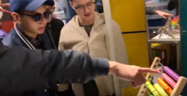 然后朋友教他:这个叫紫色、这个叫粉色!他像个小朋友一样的在努力认真的在学习。