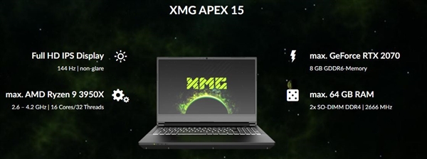 CES 2020大展期间,德国游戏本厂商XMG、著名ODM笔记本厂商蓝天(Clevo)联合展示了一台配备AMD锐龙9 3900处理器的笔记本“APEX 15”,拥有史无前例的12核心24线程。但是你以为这就完了?现在,XMG、蓝天又宣布了它的升级版,硬生生塞进去一颗16核心32线程的锐龙9 3950X!