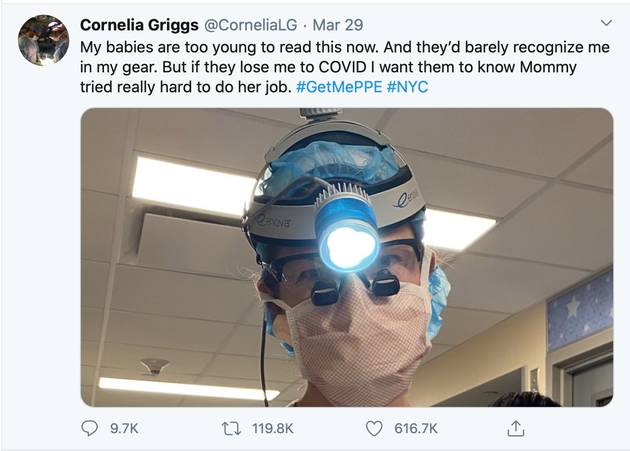 纽约市外科医生Cornelia Griggs上传了自己的工作照片。她只戴着一个薄薄的医用口罩。她写道,“如果我的孩子们在这场疫情中失去了我,我希望他们知道他们的母亲已经尽力尽责了。#给我防护用品#”。