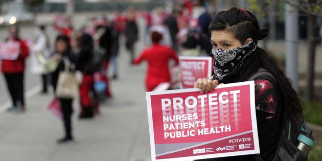 在加州旧金山湾区,Kaiser医疗集团旗下的弗里蒙特、奥克兰等医院员工近期多次在街头罢工抗议,要求得到防护用品。他们承担了救治来自至尊公主号游轮的新冠患者的重任,但却连自己的安全都无法保证。由于医疗防护用品严重不足,Kaiser医院不仅没有防护新冠病毒的N95口罩,甚至要求他们重复使用原本一次性的防护用品,或是只给她们发放普通的外科口罩。