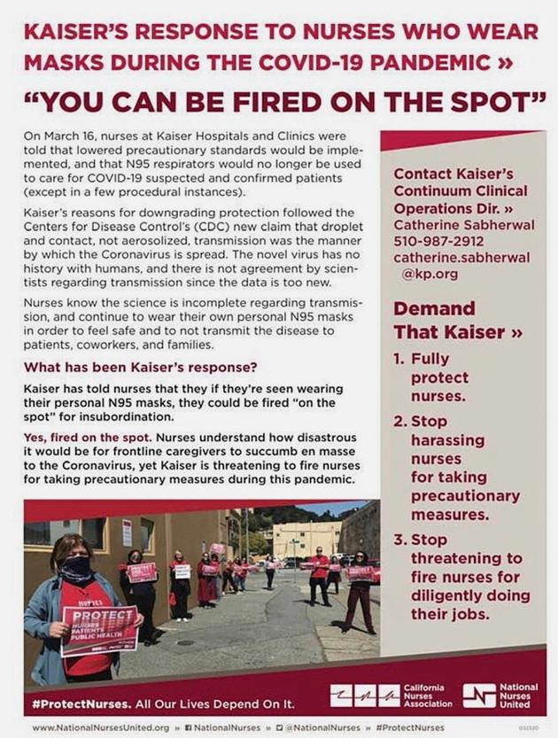 Kaiser医院甚至赤裸裸的威胁,如果发现医护人员自带N95口罩,就会立即解雇。加州护士协会(California Nurses Association)对媒体透露了Kaiser的这一内部规定。而Kaiser集团却表示,他们为医护人员提供了足够的防护设备,不让医护人员自带口罩是因为无法保证外部口罩的质量。Kaiser更否认开除员工的规定。