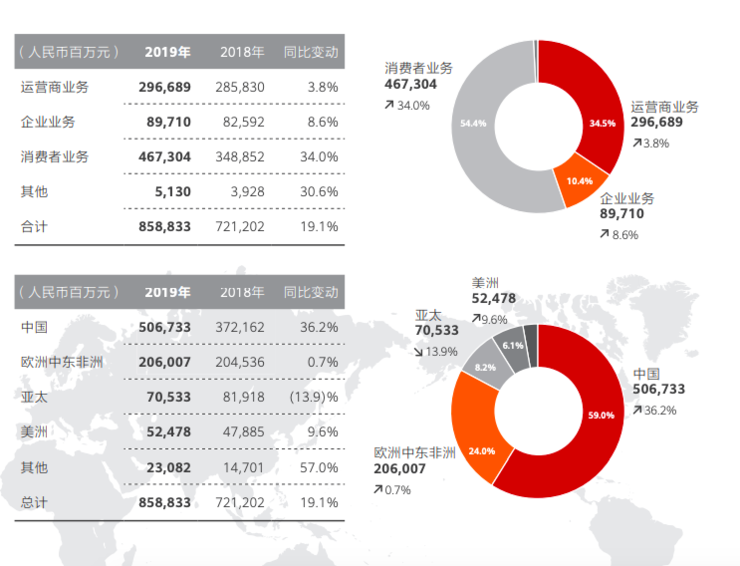 2019 年,华为在全球范围内实现销售收入 8588 亿元人民币,同比增长 19.1%——作为对比,2018 年的同比增长率为 19.5%,二者基本上持平。
