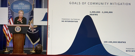 白宫应对疫情小组成员比克斯 (Deborah Birx)在发布会现场展示了预测疫情的相关模型。