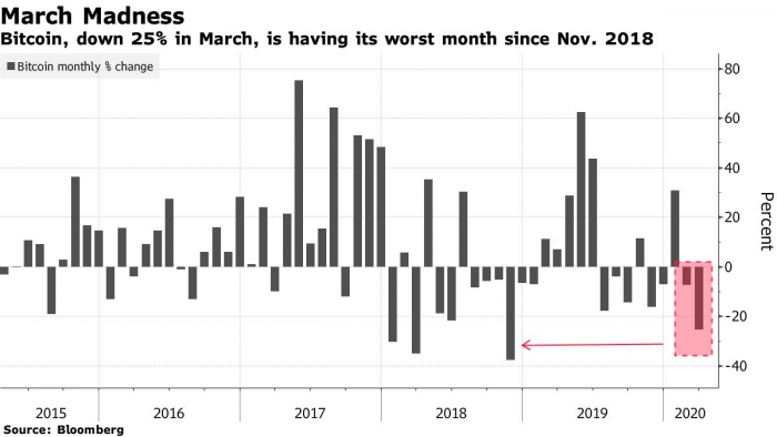 比特币3月份下跌25%,创下2018年11月以来的最大单月跌幅