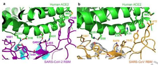 研究人员准确定位出了新冠病毒RBD与ACE2直接相互作用的氨基酸位点,发现与SARS病毒结合ACE2的模式十分相似,结合同样的ACE2氨基酸残基,两者RBD上仅仅只有几个氨基酸残基的差别。而这些微小的差异,却可以让新冠病毒结合受体能力变得更强。