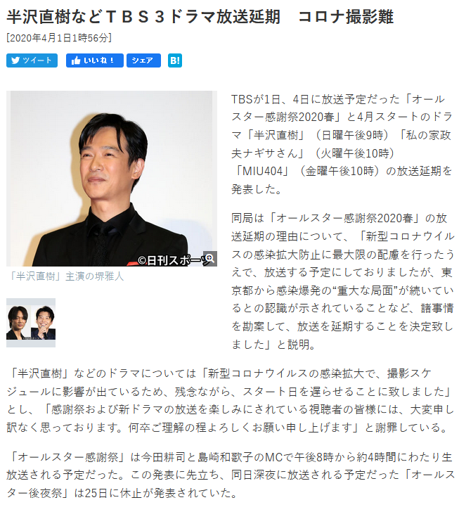 根据《日刊Sports》的今日(4月1日)报道,由于新冠肺炎疫情的原因,《半泽直树》第二季、《我的家政夫渚先生》、《MIU404》等TBS日剧拍摄计划也已经受到影响,这些日剧的开播时间将延期。