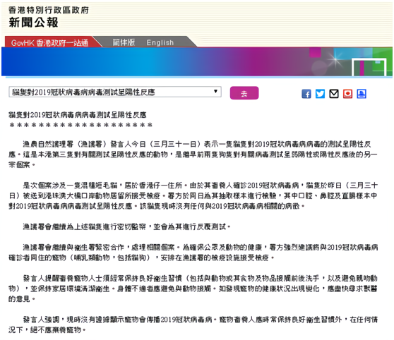 渔农自然护理署(渔护署)发言人今日(三月三十一日)表示一只猫只对2019冠状病毒病病毒的测试呈阳性反应。这是本港第三只对有关测试呈阳性反应的动物,是继早前两只狗只对有关病毒测试呈弱阳性或阳性反应后的另一宗个案。