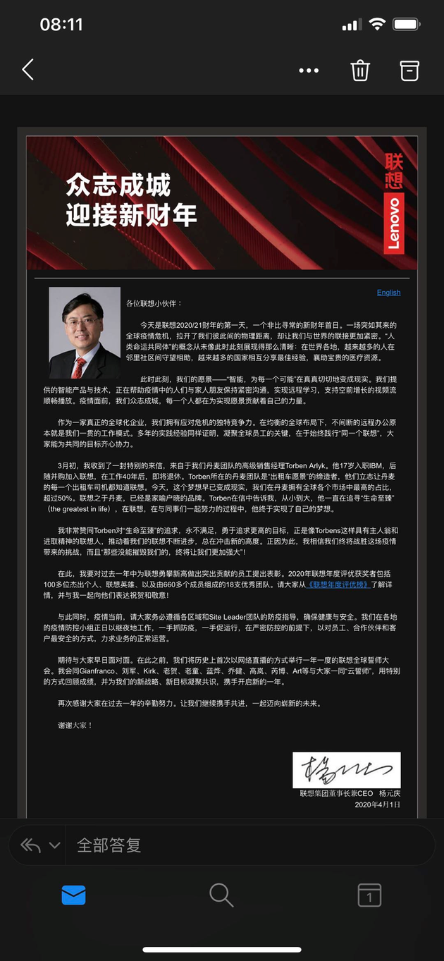 期待与大家早日面对面。在此之前,我们将历史上首次以网络直播的方式举行一年一度的联想全球誓师大会。我会同Gianfranco、刘军、Kirk、老贺、老童、蓝烨、乔健、高岚、芮博、Art等与大家一同“云誓师”,用特别的方式回顾成绩,并为我们的新战略、新目标凝聚共识,携手开启新的一年。