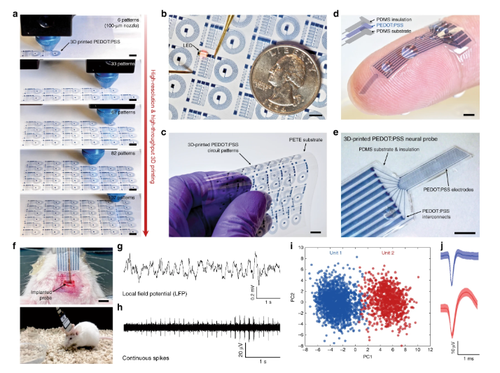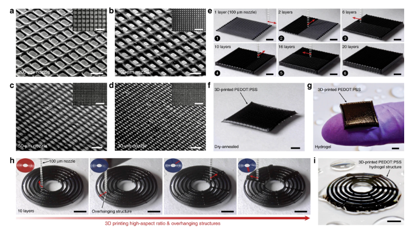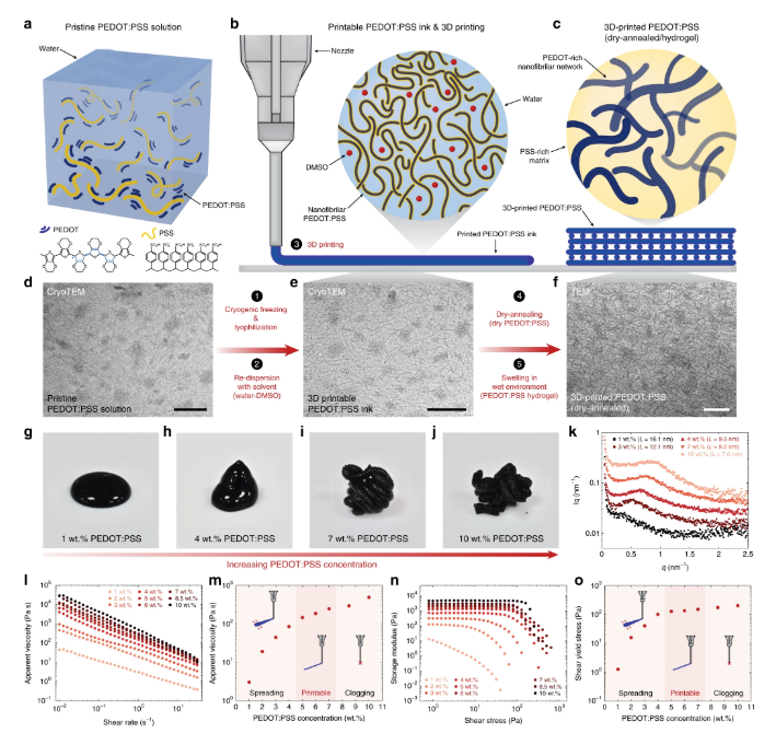 研究人员从已知的PEDOT:PS导电聚合物开始。以通常的形式,该物质非常液态且易流动-旨在用作涂料,而不用作独立对象的建筑材料。研究人员通过冷冻干燥PEDOT:PS,除去其液体成分并留下导电纳米纤维的干基质来解决此限制。然后将这些纤维与水和有机溶剂混合,产生可以通过3D打印机的喷嘴挤出以形成橡胶状电极的粘性水凝胶。