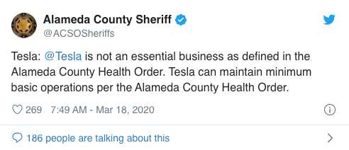 加州费利蒙市(Fremont)官员在接连几天的一系列对话中告诉特斯拉,其工厂没有被视为必需业务,因此特斯拉需要遵循阿拉米达县在3月16日发布的“就地避难令”。特斯拉随后在3月19日宣布,将在4天后暂停生产。