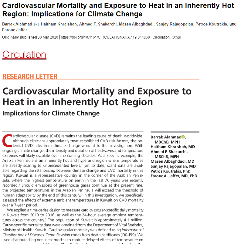 该研究报告的作者之一巴拉克·阿拉赫迈德(Barrack Alahmad)评论说:“我们星球的变暖分布不均。科威特和阿拉伯半岛等本来就很热的地区却经历了前所未有的气温飙升。”来自科威特大学的学者和波士顿哈佛大学陈公共卫生学院的博士研究生。“我们正在发出警告,世界这一地区的人们可能因高温而死于心血管疾病。”