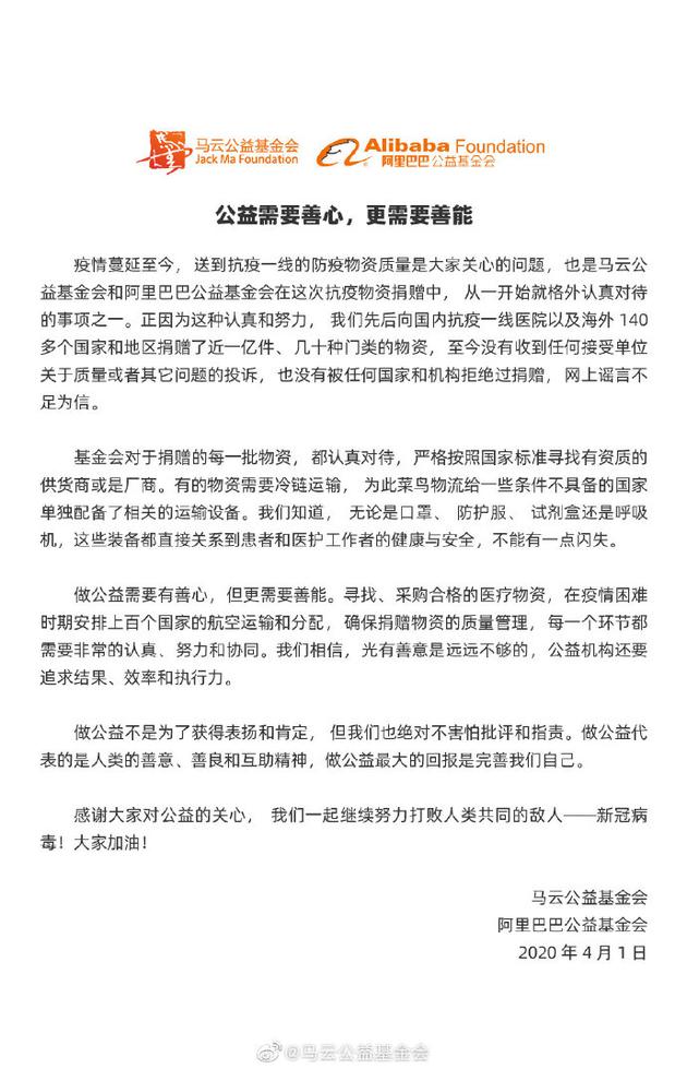 疫情蔓延至今,送到抗疫一线的防疫物资质量是大家关心的问题,也是马云公益基金会和阿里巴巴公益基金会在这次抗疫物资捐赠中,从一开始就格外认真对待的事项之一。正因为这种认真和努力,我们先后向国内抗疫一线医院以及海外140多个国家和地区捐赠了近一亿件、几十种门类的物资,至今没有收到任何接受单位关于质量或者其它问题的投诉,也没有被任何国家和机构拒绝过捐赠,网上谣言不足为信。
