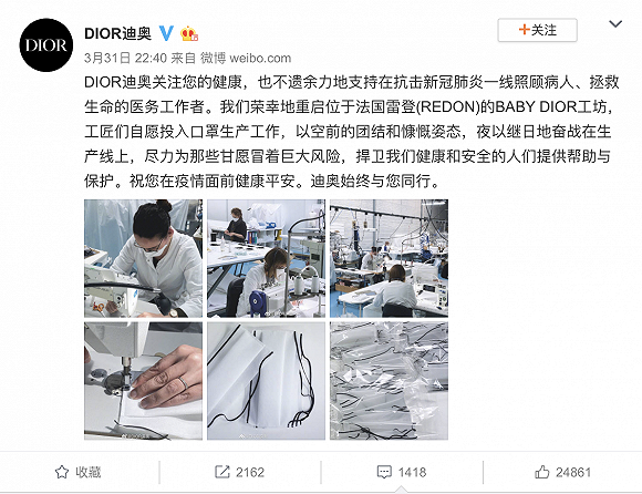 3月31日,法国奢侈品牌Dior宣布重新启动童装(Baby Dior)工坊并转产口罩。Dior的童装工厂位于法国雷登(REDON),目前在该工厂生产口罩的均为志愿服务的公司员工。Dior表示,品牌不遗余力地支持在抗击新冠肺炎一线照顾病人、拯救生命的医务工作者。