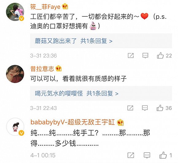 在Dior宣布转产口罩的微博评论区,有不少网友表示Dior生产的口罩“有质感”,也有网友对Dior口罩为纯手工制造而惊讶。