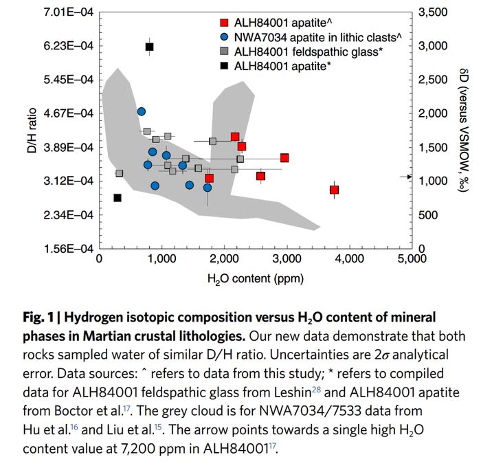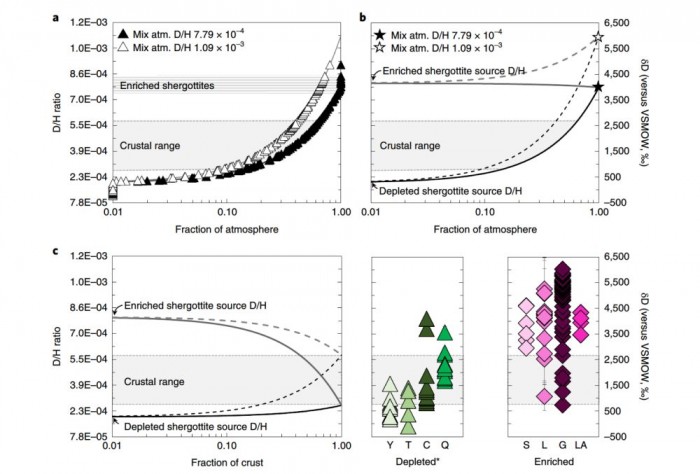 对这两块陨石的深入研究,巴恩斯和她的团队指出这些陨石中都含有大量不同的氢同位素。它们被称为“轻氢”和“重氢”,它们暗示着两种不同的水源,而且两种岩石都不匹配行星地壳的组成。