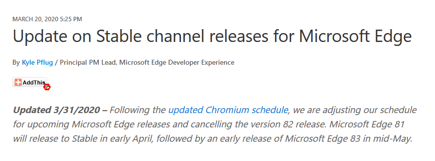 基于Chromium的Edge下个主要版本是4月初发布的Edge 81,而Edge 83将于5月中旬上线。微软解释道:“鉴于当前全球疫情的影响,Microsoft Edge团队正在暂停对Microsoft Edge稳定频道的更新。这就意味着在我们恢复更新之前,稳定通道的更新将会中止。”