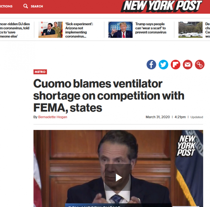 原标题:纽约州州长抱怨“与联邦政府和其他州竞购呼吸机”:真是效率低下!