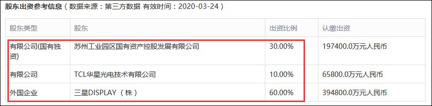 启信宝数据显示,苏州三星电子液晶显示科技有限公司由三星Display(株)、苏州工业园区国有资产控股发展有限公司与TCL华星光电技术有限公司分别持有60%、30%及10%的股份。