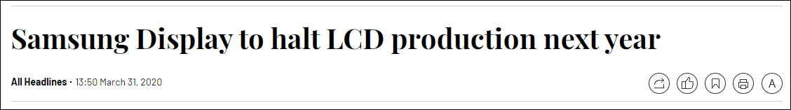 “在液晶显示器(LCD)领域,三星和LG Display已经被中国的低价攻势击溃。”去年9月,韩国《中央日报》无奈地承认。如今,新冠病毒疫情又“补了一刀”。继今年1月LG Display宣布将在年底前关闭位于韩国的LCD面板工厂后,三星显示器公司的一位发言人昨日(3月31日)也表示,该公司已决定在今年年底前停止在韩国和中国的所有LCD面板生产。