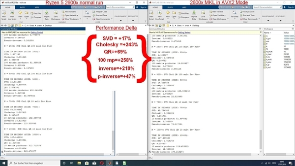 Mathwork Matlab是一款极为流行、权威的计算软件,但是去年11月的时候,有人发现AMD锐龙处理器疑似被它“劣化”,无法正确调用最新指令集,导致性能残血。Matlab会提前检测处理器身份,也就是CPUID字符串,如果找到GenuineIntel,也就是正品Intel处理器,就会利用Intel MKL(路径内核库),并调用AVX2指令集,获得理想性能。